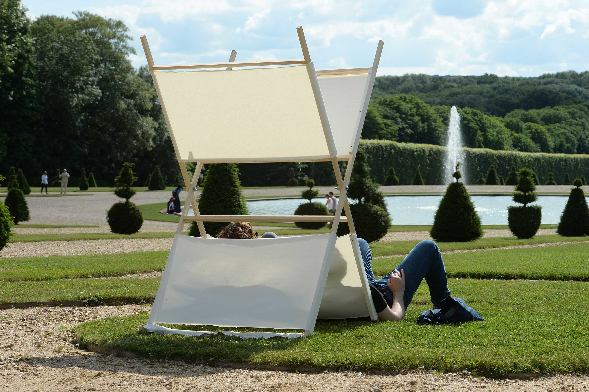 est une installation permettant aux promeneurs du parc de s’adosser et de s’abriter du soleil. Léger et facilement déployable, le dispositif encourage le public