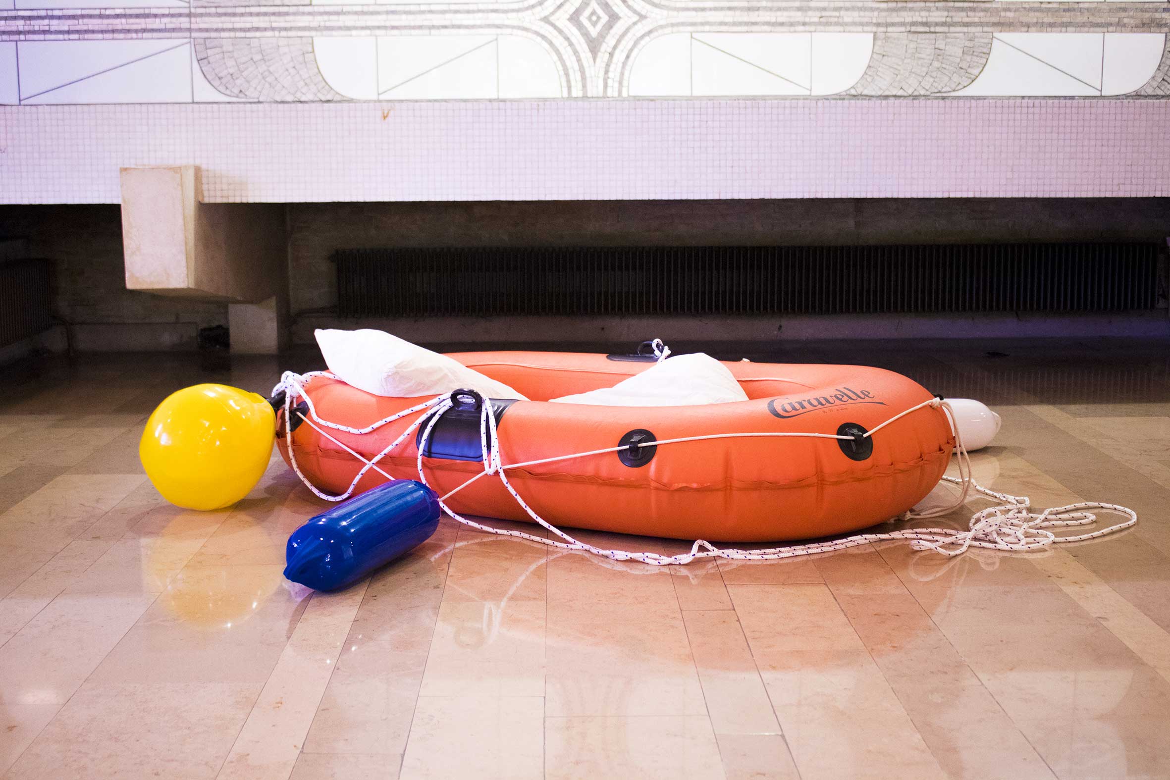 Commande de Maison Petit Point. Projet exposé à Sciences Po Lille dans le cadre de l’exposition Naufrage organisée par AR(T)CHES en 2021. Divers objets gonflables, corde, coton.