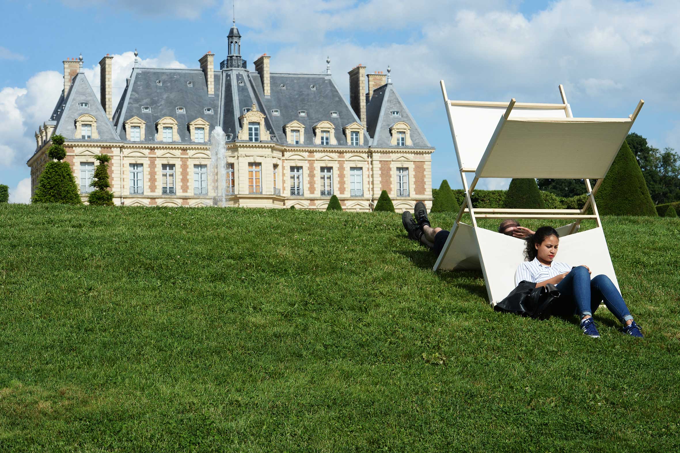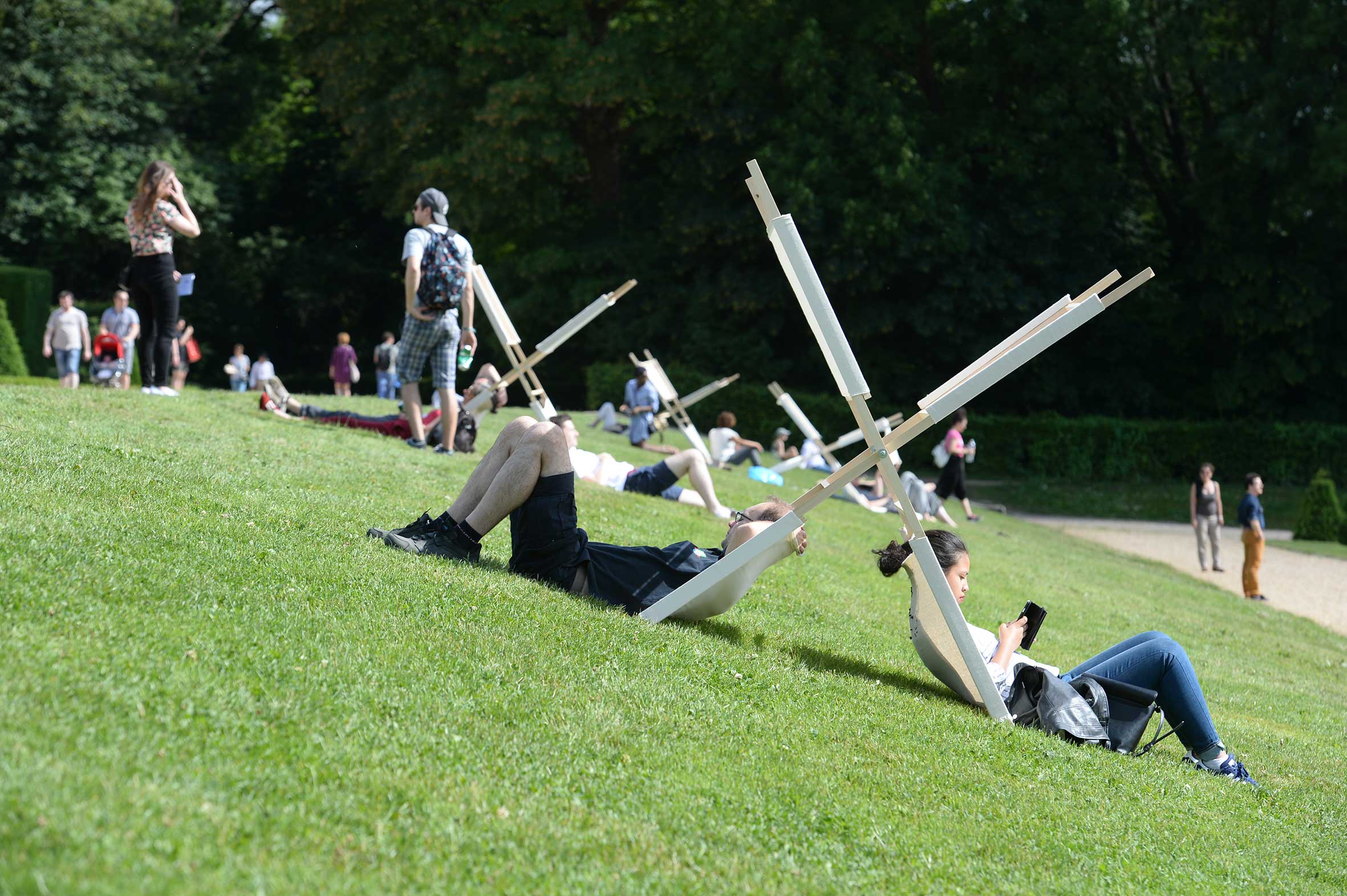 est une installation permettant aux promeneurs du parc de s’adosser et de s’abriter du soleil. Léger et facilement déployable, le dispositif encourage le public