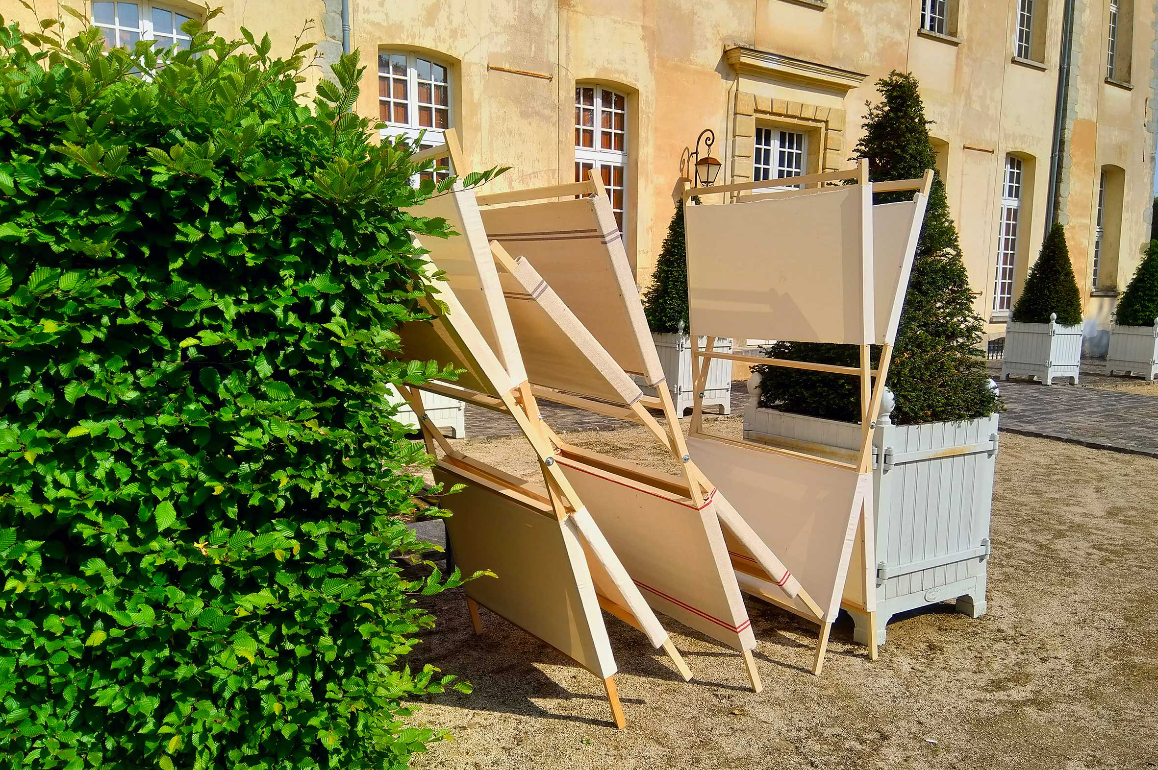 En collaboration avec Huseyin Altin, Aymeric Duriez, Théophile de Bascher, Anastasia de Villeneuve et Léa Tricaud. En partenariat avec Le Domaine départemental de Sceaux. Tasseaux en pin, toiles de coton, tourillons en hêtre,